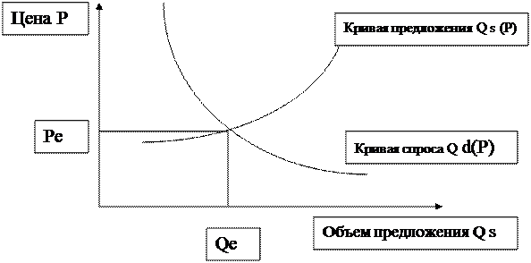 совмещения соответствующих кривых может быть определена точка рыночного равновесия, в которой рыночная цена товара такова, что объемы предложения и спроса совпадают. При равновесной цене товара Ре равновесный объем предложения Q’Ре(совпадает с равновесным объемом спроса ‚(Ре):