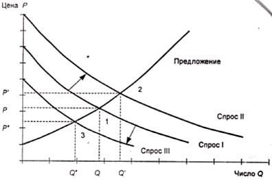 Предполагая исходное состояние рынка недвижимости, характеризуемое кривой спроса I и кривой предложения, равновесную рыночную цену объекта недвижимости можно определить значением цены Р и числом Q проданных объектов недвижимости определенного типа. Рост цен на рынке недвижимости (например, вследствие защиты сбережений от инфляции) вызывает увеличение спроса на данный тип объектов недвижимости, что отражено сдвигом кривой спроса в положение спрос II. Пересечение кривой предложения и новой кривой спроса в точке 2 соответствует установлению нового рыночного равновесия. Теперь цена устанавливается на уровне, соответствующем Р', а число предлагаемых (проданных) объектов недвижимости рассматриваемого типа будет Q '. Аналогично можно проиллюстрировать и новое рыночное равновесие, определяемое точкой 3, вследствие снижения спроса на объекты недвижимости. Тогда цена на недвижимость данного типа устанавливается на уровне, соответствующем Р", а число предлагаемых (проданных) объектов недвижимости данного типа будет Q ".