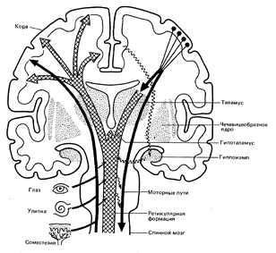 Все эти воздействия, обусловленные информацией, поступающей в мозг от органов чувств, а также степенью интенсивности мыслительной деятельности коры головного мозга и состоянием организма определяют уровень активации ретикулярной формации. Она, в свою очередь, через нервные волокна восходящей активирующей системы (Мэгун и Моруцци, 1949) поддерживает необходимый общий тонус коры больших полушарий. Таким образом, степень ретикулярной активности полностью определяется импульсами, поступающими в ретикулярную формацию. Она лишена собственной активности и является общей «системой тревоги», которая отвечает одинаково на все приходящие к ней импульсы. Ее функция - обеспечить общее «пробуждение» всей массы нейронов обоих полушарий. Поддержание уровня активности осуществляется, по-видимому, корой головного мозга, хотя и через посредство ретикулярной формации.
