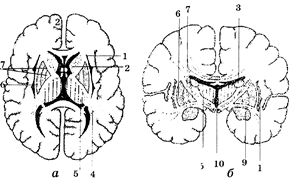 Базальные ядра полушарий: а–на горизонтальном разрезе; б– на фронтальном разрезе. 1–ограда; 5–таламус; 8–внутренняя капсула; 9– миндалина; 10– третий желудочек. Хвостатое ядро: 2–головка ядра; 3–тело; 4–хвост. Чечевицеобразное ядро: 6–скорлупа; 7–бледный шар