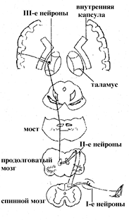 В этих ядрах лежат тела вторых нейронов. Их аксоны совершают перекрест и в составе медиальной петли проходят транзитом через мост, средний мозг и заканчиваются в латеральных ядрах таламуса. Здесь располагаются тела третьих нейронов. Их аксоны проходят через внутреннюю капсулу и оканчиваются в задней центральной извилине.