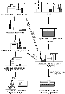 Рис.1. Схема цикла получения ядерного топлива, переработки и захоронения радиоактивных отходов