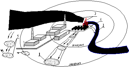 на химически опасном объекте. Поражающие факторы: 1 - залповый выброс АХОВ в атмосферу; 2 - сброс АХОВ в водоемы; 3 – "химический" пожар; 4 - взрыв АХОВ;5 - зоны задымления с осаждением АХОВ и возгонкой