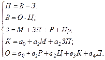 Вторым этапом моделирования является формализация (математическое описание) взаимосвязей между параметрами модели. Введем обозначения: прибыль – П; выручка – В; затраты – З; Объем реализованной продукции – О; цена продукции – Ц; затраты на материалы – М; затраты на заработную плату – З; затраты на рекламу – Р; прочие затраты – Пр; показатель качества продукции – К; доходы населения – Д. Эмпирические коэффициенты уравнений регрессии обозначим