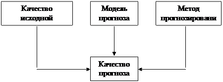 Однако, описать такие характеристики как надёжность, точность, достоверность, вычислить ошибки прогноза априори не представляется возможным, поскольку прогнозные результаты не с чем сравнивать. Поэтому и на сегодняшний день перед разработчиками прогнозов встаёт проблема: «Как оценить качество прогноза ещё до его реализации?». Определённые шаги в сторону улучшения качества прогноза можно сделать, изучив факторы, влияющие на показатели качества прогноза (рис.8).
