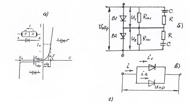 Выпускаются серии силовых диодов с предельным током Iп = 320÷200 А и повторяющимся напряжением Uпов.=100÷2000 В. На ещё большие значения должны использоваться блоки, состоящие из последовательно и параллельно включённых приборов (рис.3,б,в.).