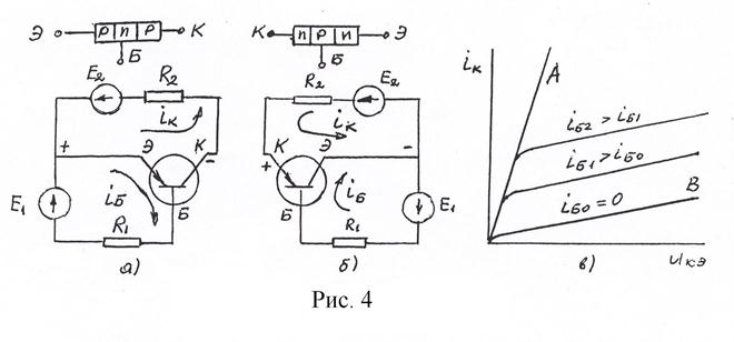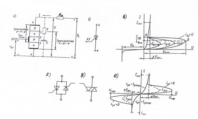 Силовые транзисторы. В преобразователях они используются в качестве ключевых элементов, т.е.работают в режиме переключения из области насыщения – включено (кривая А на рис.4,в) в область отсечки - выключено (кривая В).