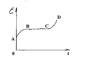 | Если наблюдается увеличение деформации при длительном действии нагрузки, то такое явление называется ползучестью.Изменение ползучести во времени показано на графике (рис.6), где: АВ - неустановившаяся ползучесть; ВС - установившаяся ползучесть; СД - разрушение. Явления релаксации напряжений и ползучести в настоящее время могут быть объяснены с точки зрения несовершенства кристаллической структуры твердого тела. | . Рис.6 Изменение ползучести во времени. |