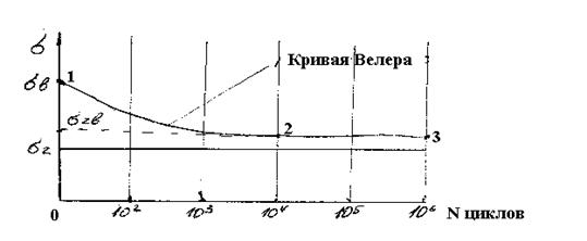 Точка кривой, при которой материал разрушается с одного нагружения соответствует пределу прочности (точка 1). В точках sz не происходит разрушения при базовых испытаниях. Эта линия будет асимптотой, к которой кривая стремится в пределе. Напряжение sz называется пределом усталости или пределом выносливости (точка 2).