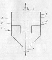 Сточная вода с маслопродуктами движется вверх. Плотность примесей менее и они концентрируются в ядре закрученного потока и поступают в камеру (3), через трубопровод (5) маслопродукты выводятся из гидроциклона. Сточная вода очищенная от твердых частиц и масла, скапливается в камере (2) откуда через трубопровод (6) выводится для дальнейшей очистки. Воздух из ядра закрученного потока уходит в трубу (4).