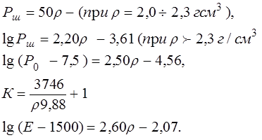 Ф. А. Аксеров установил зависимость твердости Рш, предела текучести Р0, коэффициента пластичности К и модуля Юнга от плотности пород r.