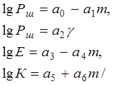 По И. С. Финогенову, для глинисто-карбонатных пород Рш, Е и К в зависимости от пористости m и объемного веса породы g описываются уравнениями вида:
