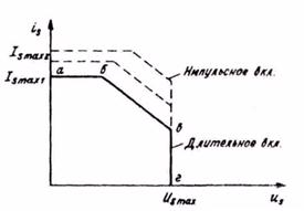 На рис. 6.2 представлена область безопасной работы ключа, ограниченная допустимыми значениями IS, US, и РS. ОБР ограничена тремя линейными участками: аб – предельным значением тока IS max, бв – предельной мощностью потерь PS max, и вг – предельным значением напряжения US max.