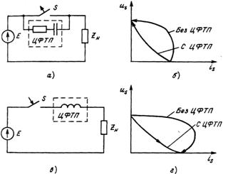 На рис. 6.3 представлены упрощенные схемы ЦФТП. Схемы а) и в) используются для формирования требуемых ВАХ при коммутации активно-емкостной нагрузки. Соответствующие динамические ВАХ в схеме с ЦФТП и без неё представлены на рис. 6.3., б,г.