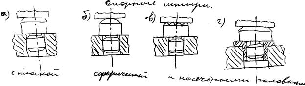 Откидные (б) и отводные (в) упоры применяются в тех случаях, когда форма деталей при конструкциях изделия не позволяет свободно снять его после прихватки с приспособления. Длина рабочей части упоров должна быть не меньше 2-х толщин фиксируемой детали. В качестве вспомогательных опор могут применяться самоустанавливающиеся одноточечные (ГОСТ 131159-67) и подводимые клиновые опоры.