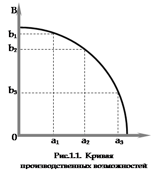Различные комбинации взаимоисключающих (альтернативных) благ А и В представлены на рис.1.1. Кривая, соединяющая точки, которые отражают непрерывное множество комбинаций производства альтернативных благ, называется кривой производственных возможностей, или кривой трансформации.
