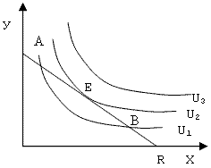 Данный выбор можно изобразить графически. Используя кривые безразличия (U)и бюджетную линию (R):