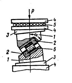 Рис.16 | 1 - матрицы 2 - клинья 3 - плиты 4 - ролики 5 - образец породы Условия испытания следующие: образец для испытания должен быть диаметром d= 42 ± 0,1 мм высотой h = 42 ± 2,5 мм . Параллельность, выпуклость торцов, а также их перпендикулярность к образующей цилиндра должна быть не больше 0,05 мм. |