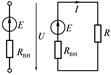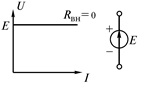 Если при работе источника он не нагревается, то потери энергии внутри отсутствуют и источник называется идеальным. Напряжение между выводами идеального источника ЭДС не зависит от тока. Вольтамперная характеристика его, называемая внешней характеристикой, изображена на рис. 3,а, схематично на рис. 3, б. Однако все источники при работе нагреваются, поэтому обладают внутренним электрическим сопротивлением Rвн. Эквивалентная схема такого источника приведена не рис. 3,в, а на рис.3,г изображена схема соединения источника с нагрузкой.