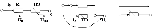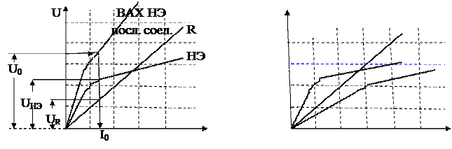 ток одинаков, входное напряжение равно сумме напряжений на элементах, строим суммарную ВАХ НЭ0 для последовательного соединения. Для чего возьмем несколько значений тока и при этом токе произведем сложение на графике напряжений, получим точки, соединив которые найдем искомую ВАХ. Теперь, по известному напряжению U0 находим ток I0, а пересечения с ВАХ соответствующих элементов дают напряжения на элементах UR и UНЭ.