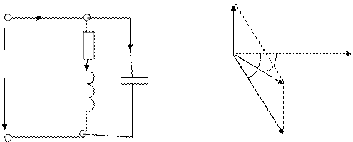 На рис. 20,б приведена векторная диаграмма. Ток нагрузки отстает от напряжения на угол φн, ток же через емкость опережает напряжение на угол 900. Сложив эти два тока, получим ток в неразветвленной части цепи, который меньше тока нагрузки. Одновременно уменьшатся и угол φ. Уменьшая емкость, можно добиться того, что суммарный вектор тока I попадет на вектор U, тогда φ = 0 и возникает резонанс токов, при котором ток в неразветвленной части цепи минимален, а токи в ветвях оказываются больше по величине.