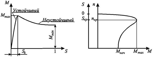 Максимум вращающегося момента разделяет кривую М = f(S) на устойчивую часть от 0 до Sk и неустойчивую часть от Sk до S = 1.