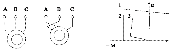 Реверс асинхронного двигателя осуществляется изменением направления вращения поля статора. В свою очередь, для изменения вращения поля, нужно изменить чередование фаз. Это достигается перекрещиванием двух фаз как показано на рис. 55,б. На рис. 55,а показано обозначение асинхронного трехфазного короткозамкнутого двигателя.