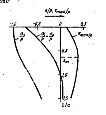Рис.28 График изменения напряжений в полупространстве на оси симметрии (r=0)