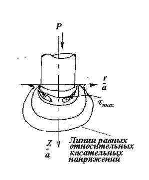 цилиндра,т. к. давление по контуру много выше, чем под остальной плоскостью вдавливания, то и касательные напряжения, возникающие в глубине тела по контуру давления, достигают предельных значений много раньше, чем на оси симметрии.