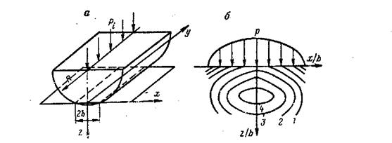 Установлено, что максимальные напряжения имеют место на плоскости симметрии на некоторой глубине от поверхности и зависят только от коэффициента Пуассона. Графически распределение давления представлено на рис.33.