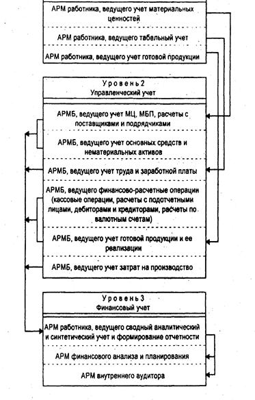 На крупном предприятии обработка учетной информации с помощью БУИС ведется на трех уровнях, соответствующих первичному (сбор, регистрация, накопление, хранение информации и передача ее для дальнейшей обработки), управленческому (сметы, нормативы, калькуляции) и финансовому (обобщение, синтез информации) учету (рис.2.6). На каждом уровне в соответствии с методологией сбора, регистрации и обработки учетной информации создаются АРМ экономистов, бухгалтеров, финансистов и аналитиков, взаимодействующие между собой.