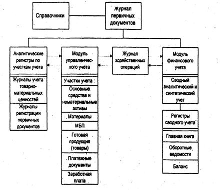 Ведение же учета по отдельным участкам, например таким, как учет труда и заработной платы, учет готовой продукции и ее реализации, учет основных средств и нематериальных активов, учет материальных ценностей, сводный учет и др., осуществляется посредством применения отдельных программных модулей (блоков).