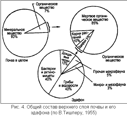 | Исходя из степени подвижности и размеров, вся почвенная фауна сгруппирована в следующие три экологические группы: Микробиотип, или микробиота (не путать с эндемиком Приморья – растением микробиотой перекрестнопарной!): организмы, представляющие промежуточное звено между растительными и животными организмами (бактерии, зеленые и сине-зеленые водоросли, грибы, простейшие одноклеточные). Это водные организмы, но мельче обитающих в воде. Живут в порах почвы, заполненных водой – микроводоемах. Основное звено детритной пищевой цепи. Могут высыхать, а с возобновлением достаточной влажности вновь оживают. Мезобиотип, или мезобиота– совокупность мелких, легко извлекающихся из почвы подвижных насекомых (нематоды, клещи (Oribatei), мелкие личинки, ногохвостки (Collembola) и др. Очень многочисленны – до миллионов особей на 1м2. Питаются детритом, бактериями. Пользуются естественными полостями в почве, сами не роют себе ходов. При снижении влажности уходят вглубь. Приспособления от высыхания: защитные чешуйки, сплошной толстый панцирь. "Паводки" мезобиота пережидает в пузырьках почвенного воздуха. Макробиотип, или макробиота– крупные насекомые, дождевые черви, подвижные членистоногие, живущие между подстилкой и почвой, другие животные, вплоть до роющих млекопитащих (кроты, землеройки). Преобладают дождевые черви (до 300 шт/м2). Каждому типу почв и каждому горизонту соответствует свой комплекс живых организмов, участвующих в утилизации органики – эдафон. Наиболее многочисленным и сложным составом живых организмов обладают верхние – органогенные слои-горизонты (рис. 4). В иллювиальном обитают только бактерии (серобактерии, азотфиксирующие), не нуждающиеся в кислороде. |
