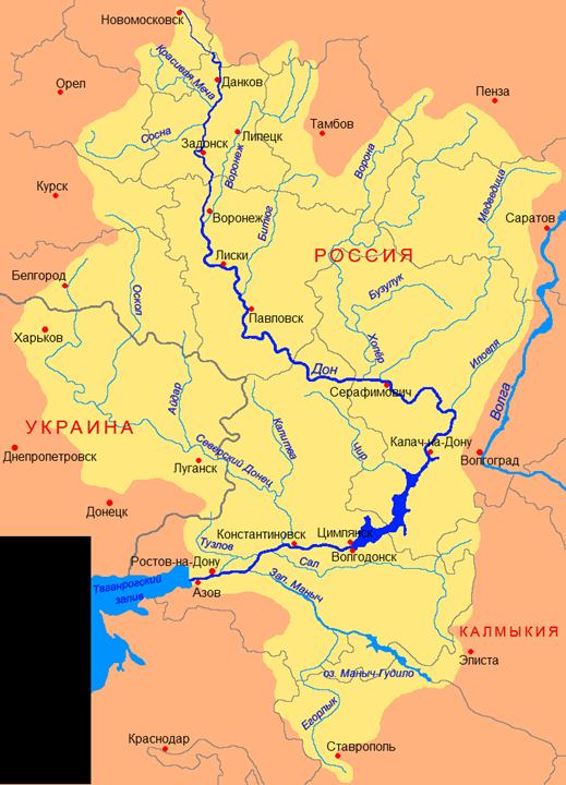 Дон берет начало в г. Новомосковске Тульской области. Впадает в Таганрогский залив Азовского моря. Площадь бассейна Дона 422,5 тыс. км². По площади бассейна Дон в Европе уступает только Волге, Днепру, Дунаю и Каме. Длина Дона 1870 км. Устье Дона Дельта Дона — Таганрогский залив Азовского моря. От Ростова-на-Дону образует дельту площадью 540 км². Там русло Дона разделяется на многочисленные рукава и протоки. Исток Дона расположен в северной части Средне-Русской возвышенности, на высоте около 180 м над уровнем моря в черте города Новомосковска Тульской области. Официально принято считать истоком Дона ручей в детском парке, где и установлен архитектурный комплекс «Исток Дона», который символизирует слияние рек Дон и Шат. По территории Волгоградской области Дон протекает на протяжении 537 км. Для Дона характерно асимметричное строение долины. Правый коренной берег — высокий и крутой, а левый — пологий и низменный. Долина Нижнего Дона была перекрыта плотиной ГЭС, в результате чего образовалось Цимлянское водохранилище. Его площадь 2700 кв.км, средняя ширина водоема около 12 км, наибольшая - 30 км., длина 260 км. Сарке́л (хазарск. «белый дом»), также Белая Вежа Киевской Руси — хазарский, позже русский, город-крепость на левом берегу Дона. В настоящее время - на дне Цимлянского водохранилища.