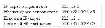 Следующие четыре поля: аппаратный адрес отправителя (Ethernet адрес в данном примере), адрес протокола (IP адрес), аппаратный адрес назначения и адрес протокола назначения. Обратите внимание, что в данном случае происходит некоторое дублирование информации: аппаратный адрес отправителя может быть получен как из Ethernet заголовка, так и из ARP запроса.