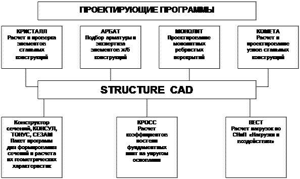 • проектно-аналитические программы КРИСТАЛЛ и АРБАТ, которые предназначены для решения частных задач проверки и расчета элементов стальных и железобетонных конструкций в соответствии с требованиями нормативных документов (СНиП);