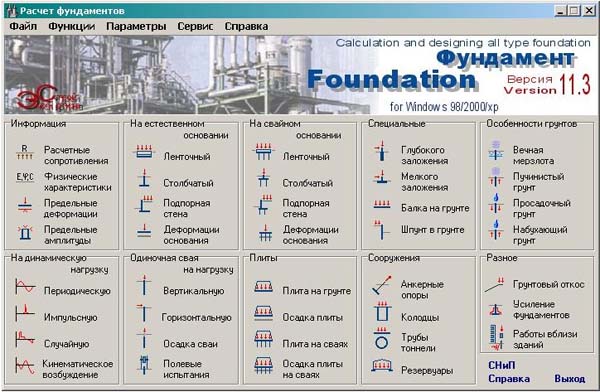 В настоящее время в этой программе реализованы все без исключения расчеты СНиП 2.02.02-83* «Основания зданий и сооружений», СП 50-101-2004 «Проектирование и устройство оснований и фундаментов зданий и сооружений», СНиП 2.02.03-85 «Свайные фундаменты», СП 50-102-2003 «Проектирование и устройство свайных фундаментов», СНиП 2.02.05-87 «Фундаменты машин с динамическими нагрузками», и почти все расчеты СНиП 2.02.04-88 «Основания и фундаменты на вечномерзлых грунтах», в т.ч. теплотехнические. Кроме того имеется ряд востребованных расчетов, не входящих в СНиП.