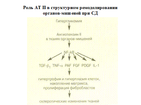 Исследования последних 10–15 лет доказали ведущую роль активации РААС в развитии АГ и сосудистых осложнений при СД – диабетической нефропатии, ретинопатии, ишемической болезни сердца. Поворотным моментом в переосмыслении значимости этой системы в развитии патологии различных органов явилось обнаружение локальных тканевых РАС, найденных в клетках почек, сердца, мозга, эндотелии сосудов и других тканях. В экспериментальных и клинических исследованиях установлено, что при СД под воздействием гипергликемии происходит гиперактивация тканевых РААС. При этом секреция основного субстрата этой системы – ангиотензина II (АТ II) – тканью почек, сердца, эндотелием сосудов при СД повышается во много раз. В частности установлено, что локально почечная концентрация АТ II в тысячи раз превышает его содержание в плазме крови. Механизмы патогенного действия АТ II обусловлены не только его мощным вазоконстрикторным действием, но и пролиферативной, прооксидантной и протромбогенной активностью. Активируя целый комплекс цитокинов, АТ II способствует развитию фиброза и склероза ткани, в которой он локально синтезирован, будь то ткань почек, сердца, сосуды сетчатки или эндотелий сосудов.