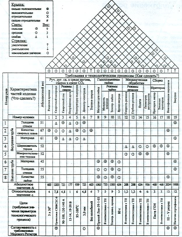 На третьем этапе характеристики частей спроектированного изделия трансформируются в конкретные технологические операции, обеспечивающие получение изделия с заданными свойствами. При выполнении данного этапа основные характеристики МТВД, перечисленные в горизонтальных строках 1..9 матрицы проектирования технологического процесса изготовления МТВД (рис. 21.8), были взяты из второго этапа.