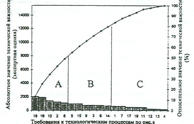 | № колонки | Требования к технологическим процессам | Абсолютное значение (экспертная оценка) | Относительное значение, % | Кумулятивный процент |