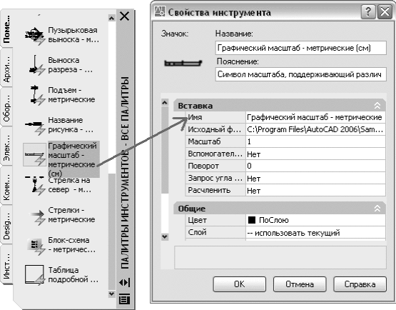 Можно изменять свойства любого из инструментов на палитре. После создания инструмента на палитре его свойства можно изменять. К таким свойствам, например, относятся масштаб блока при вставке в рисунок и угол поворота образца штриховки.