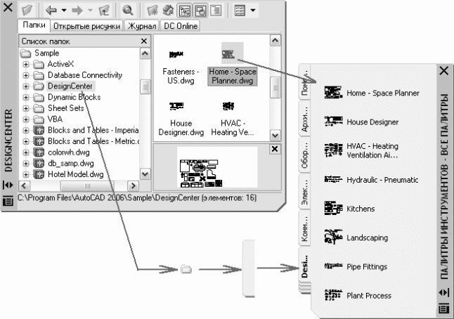■ Перетаскивание мышью на палитру любого из следующих элементов рисунка: штриховок, градиентных заливок, блоков, внешних ссылок, растровых изображений.