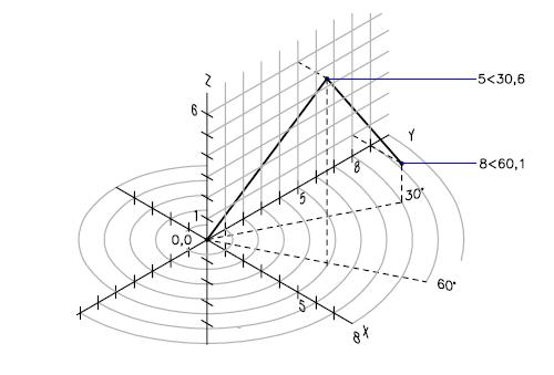 В следующих примерах предполагается, что этот динамический вид отключен, или что координаты введены в командной строке. При использовании динамического ввода можно задавать абсолютные координаты с префиксом #. В приведенной ниже иллюстрации координатами 5<60,6 определяется точка, лежащая на расстоянии 5 единиц от начала текущей ПСК, под углом 60 градусов к оси X в плоскости XY и 6 единиц по оси Z. координатами 8<30,1 определяется точка, лежащая на расстоянии 8 единиц от начала текущей ПСК в плоскости XY, под углом 30 градусов к оси X в плоскости XY и на расстоянии 1 единицы по оси Z.