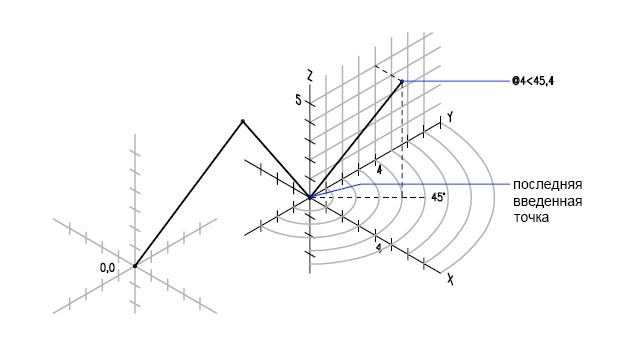 Для задания координат относительно предыдущей точки можно использовать относительные цилиндрические координаты, предваряя числовые значения знаком @. В приведенной ниже иллюстрации координатами @4<45,5 определяется точка, лежащая в плоскости XY на расстоянии 4 единицы от последней введенной точки, под углом 45 градусов от положительной оси X и на расстоянии 5 единиц в направлении Z.