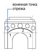 Имеется возможность построения дуги путем задания трех точек. В следующем примере начальная точка дуги совпадает с конечной точкой отрезка. Вторая точка дуги привязана к средней окружности.