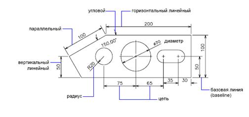 Размеры можно создавать для разных типов объектов, которые могут быть ориентированы разным образом. Существуют следующие основные типы нанесения размеров.