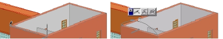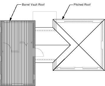 Переместим курсор к углу стены, откуда будет начинаться цилиндрическая крыша. Кликнем и переместим курсор чтобы указать ширину цилиндрической крыши. Кликнем на углу стены после чего отобращиться палитра с тремя параметрами. Выберем параметр Curved Barrel Vaulted (изогнутый цилиндрический свод).