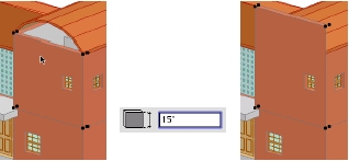 · Подрезка крыши в 3D: Следующим шагом будет соединение стены с начерченой нами крышей. Чтобы сделать это, нам нужно растянуть стену и обрезать ее на уровне крыши. Выберем инструмент стрелки (Arrow Tool) и кликнем на стене, как показано на рисунке внизу слева. Активизируем Wall Tool (инструмент создания стен) и изменим высоту стены 15'-0" чтобы стена была выше чем крыша.