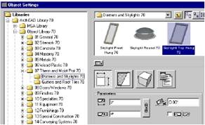 · Установка потолочного окна: Объекты потолочных окон сохранены в каталогах Dormers и Skylights стандартной библиотеки ArchiCAD. Двойным кликом активизируйте инструмент работы с объектами (Object Tool) и выберите Skylight Top Hung из библиотеки ArchiCAD. Расположение потолочных окон в библиотеке ArchiCAD показано ниже. Установите значения параметров как показано на рисунке. Установите текущий уровень в Roof.