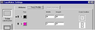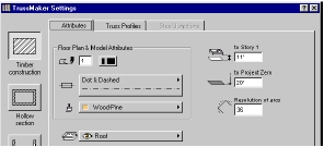 · Установка параметров: отобразится диалогове окно Object Settings, в котором можно установить параметры для деревянного каркаса, полного профиля и стале-проката. Выберем деревянный каркас (Timber Construction) и кликнем на панели аттрибутов. Введем 11' для высоты фермы. Установим материал в Wood-Pine (дерево-сосна), и установим уровень как Roof как показано ниже.